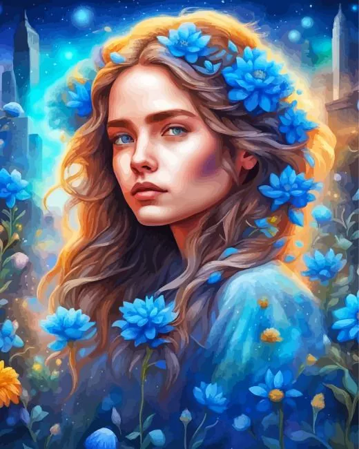 Aesthetic Girl With Blue Flowers Art 5D Diamond Painting