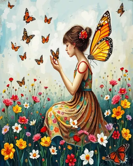 Butterfly Girl In Flowers Meadow 5D Diamond Painting